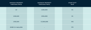 The amount you pay will depend on the value of the property you’re purchasing. The Stamp Duty payable is a percentage of the property purchase price within each tax band. See here for more detail: