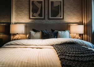TIP: Use floor to ceiling curtains on a discreet curtain track which can often fool the eye into thinking that the ceiling height is actually higher than you think! And not forgetting texture. Textured wallpapers as opposed to large patterns can make a room feel more upmarket and welcoming. Pair this with fabric scatter cushions and low lighting, and you can create a simple and easy cosy and homely feel.